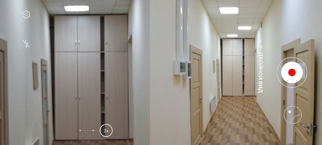 Отдельно стоит отметить впервые появившийся двойной режим совмещенной видеосъемки на основной и телеобъективы. Картинка делится надвое, показывая «нормальный» вид и тут же его приближенный вариант. Побаловаться любопытно, но в целом игрушка бесполезная, тем более что качество при этом невысокое. Автофокус в двойном режиме работает, но выставлять точку фокусировки нажатием нельзя.