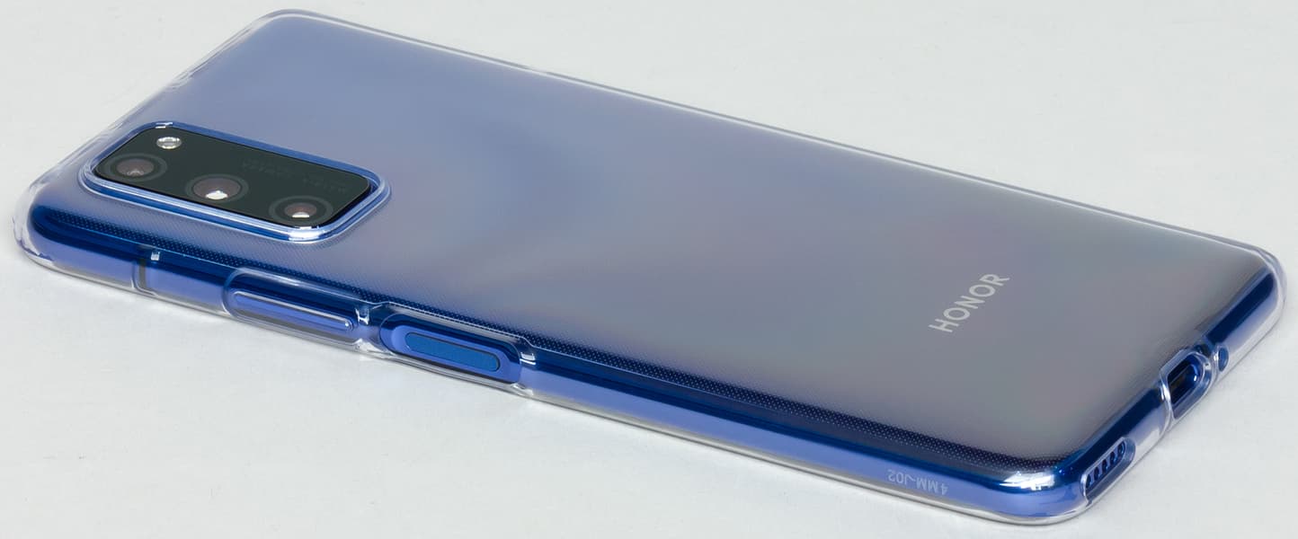 Комплектный чехол — прозрачный и гибкий, он достаточно толстый, чтобы с ним задняя поверхность получилась ровной. В чехле смартфон лежит на твердой поверхности устойчиво.