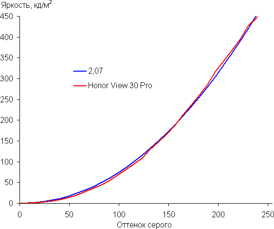 Контрастность (примерно в центре экрана) высокая — порядка 1200:1. Время отклика при переходе черный-белый-черный равно 22 мс (10,5 мс вкл. + 11,5 мс выкл.). Переход между полутонами серого 25% и 75% (по численному значению цвета) и обратно в сумме занимает 36 мс. Построенная по 32 точкам с равным интервалом по численному значению оттенка серого гамма-кривая не выявила завала ни в светах, ни в тенях. Показатель аппроксимирующей степенной функции равен 2,07, что ниже стандартного значения 2,2. При этом реальная гамма-кривая заметно отклоняется от степенной зависимости: