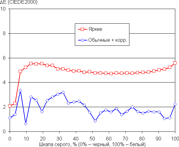 На графиках ниже кривые Яркие соответствуют результатам без какой-либо коррекции цветового баланса (профиль Яркие), а кривые Обычные + корр. — данным, полученным после выбора профиля Обычные и ручной коррекции цветового баланса (точка на круге коррекции — как на снимке выше). (Самые темные области шкалы серого можно не учитывать, так как там баланс цветов не имеет большого значения, да и погрешность измерений цветовых характеристик на низкой яркости большая.)