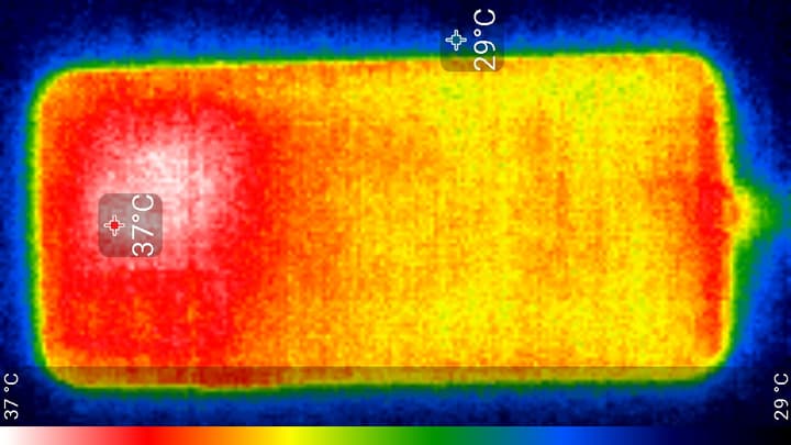 Нагрев больше в верхней части аппарата, что, видимо, соответствует расположению микросхемы SoC. По данным теплокамеры, максимальный нагрев составил 37 градусов (при температуре окружающего воздуха в 24 градуса), это не очень много.