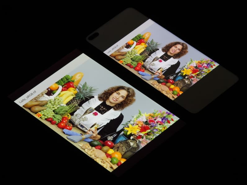 Экран имеет хорошие углы обзора без значительного сдвига цветов даже при больших отклонениях взгляда от перпендикуляра к экрану и без инвертирования оттенков. Для сравнения приведем фотографии, на которых на экраны Honor View 30 Pro и Nexus 7 выведены одинаковые изображения, при этом яркость экранов изначально установлена примерно на 200 кд/м², а цветовой баланс на фотоаппарате принудительно переключен на 6500 К.
