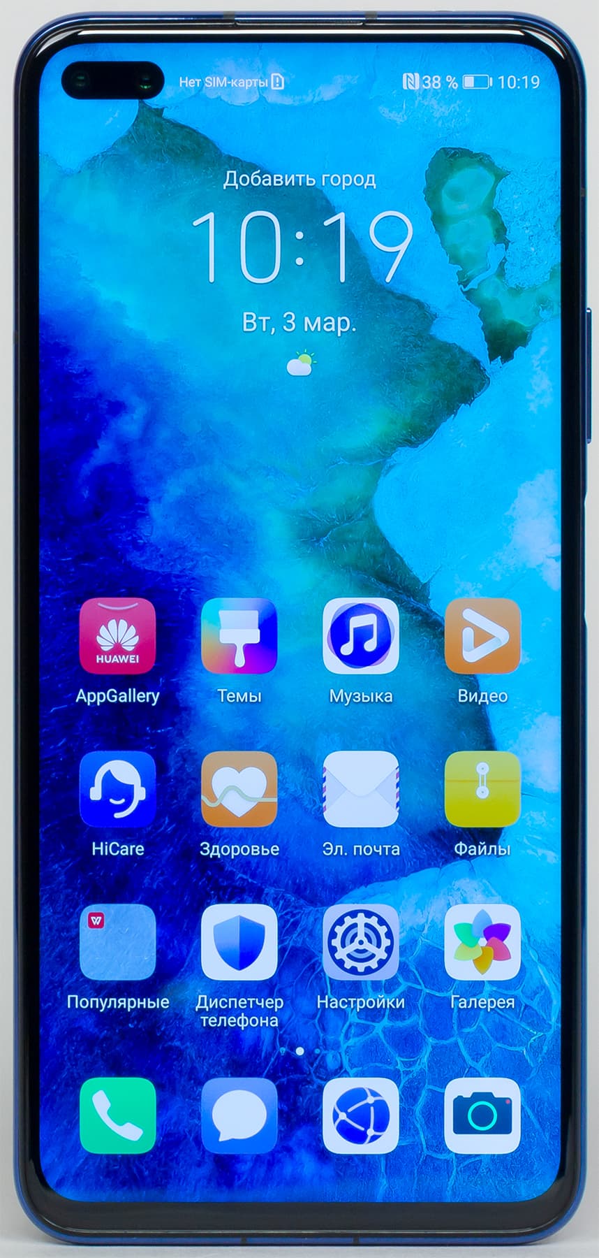 Смартфон Honor View 30 Pro выпускается в трех основных цветах: синем, черном и белом (Ocean Blue, Midnight Black, Icelandic Frost). Корпус не получил защиты от воды.