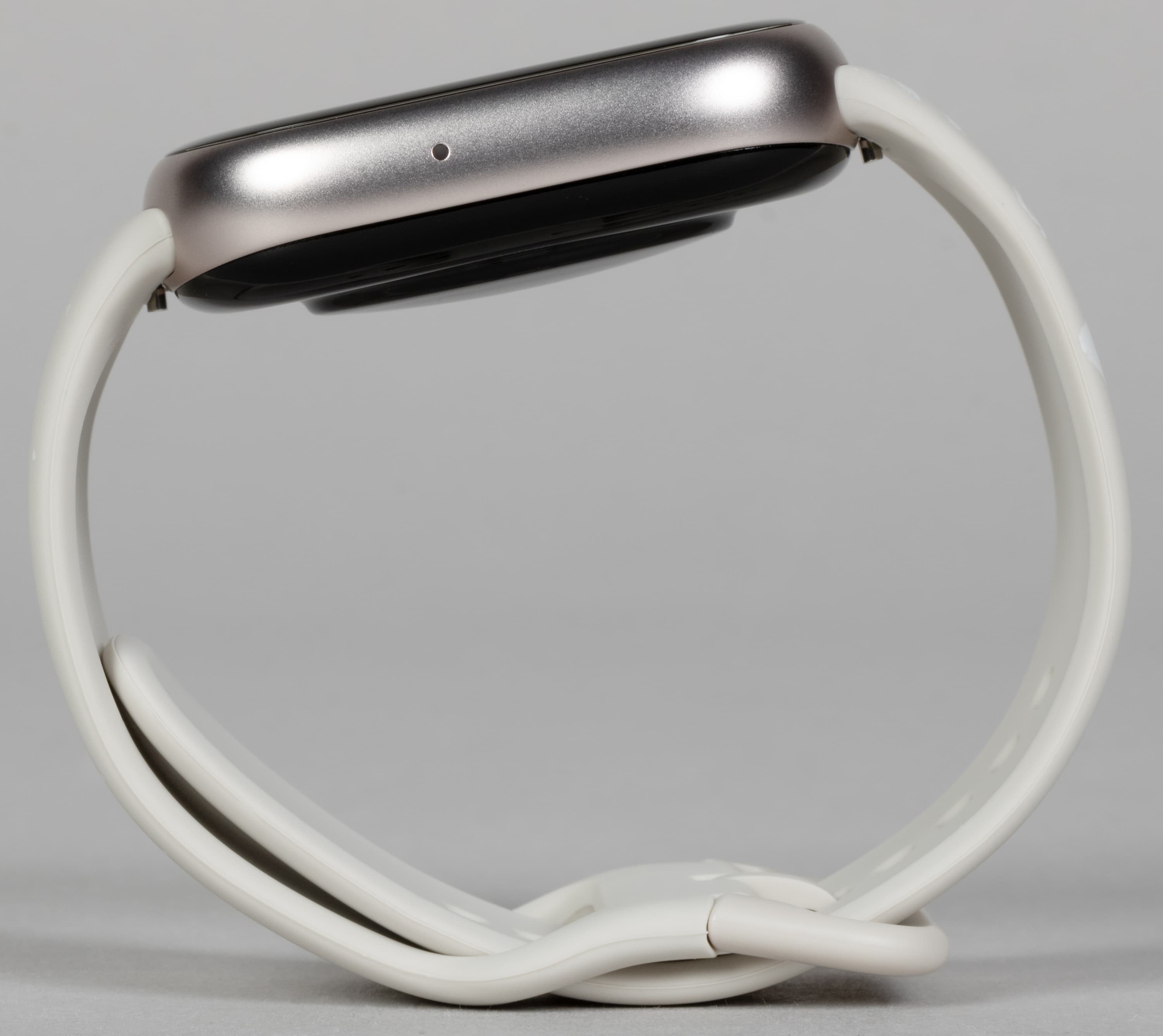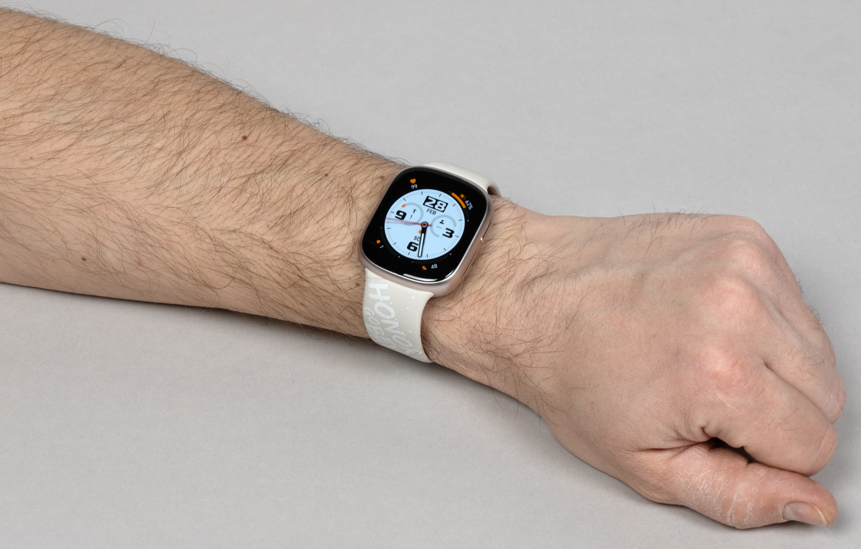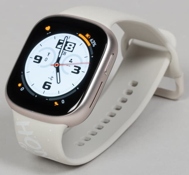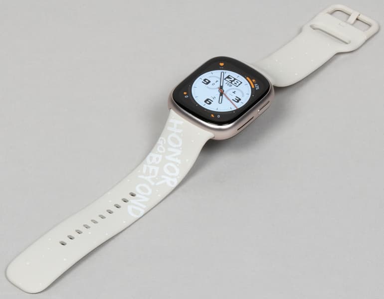 В остальном же — алюминиевый корпус с сильно скругленными углами и гранями, внешне идентичное Apple Watch крепление ремешка к корпусу (на самом деле нет), черная тыльная поверхность, продолговатая кнопка сбоку, даже сам ремешок — ну, кажется, дизайнеры устройства не скрывали источник вдохновения.
