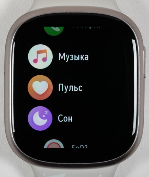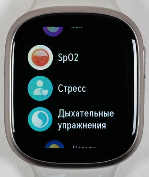 Меню приложений решено в виде вертикального списка. В нем опять же почти никаких сюрпризов нет, за одним исключением (о нем ниже). Итак, пользователю доступны: «Тренировки» (выбор очень большой, в том числе водные виды спорта, но почему-то нет лыж, хотя есть кэндо, брусья, танцы живота, дартс и прочая экзотика), «Телефон» (набор номера для телефонного звонка через Bluetooth смартфона), «Музыка» (воспроизведение музыкой, загруженной с Android-смартфона на часы; для пользователей iOS, увы, опция бесполезна), «Пульс», «Сон», SpO2 (измерение уровня кислорода в крови), «Стресс» (определение уровня стресса на основе различных параметров), «Дыхательные упражнения», «Погода», «Будильник», «Секундомер», «Таймер», «Компас», «Фонарик» (экран часов включается на максимальную яркость и отображает белое поле), «Поиск устройства» (то есть смартфона).