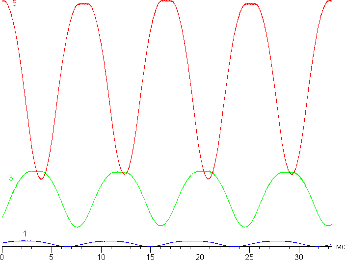 На графике зависимости яркости от времени определяется значимая модуляция с частотой 118 Гц, а при желании на некоторых изображениях при быстром движении часов относительно глаз можно выявить стробоскопических эффект. Однако по факту при обычном использовании мерцание не обнаруживается, так как фаза модуляции различается по площади экрана. На рисунке ниже приведены зависимости яркости (вертикальная ось) от времени (горизонтальная ось) для нескольких значений настройки яркости.