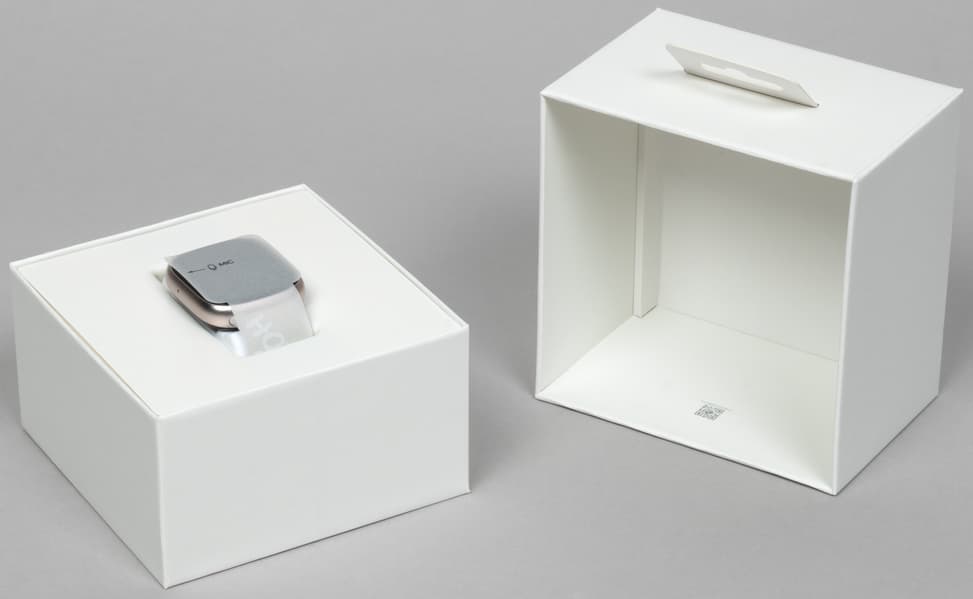 Внутри коробки часы располагаются в картонной прорези, и поскольку со всех сторон они надежно защищены, риск повреждения при транспортировке минимален.