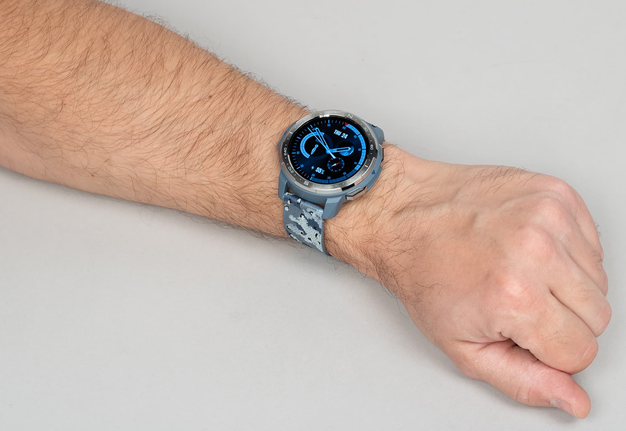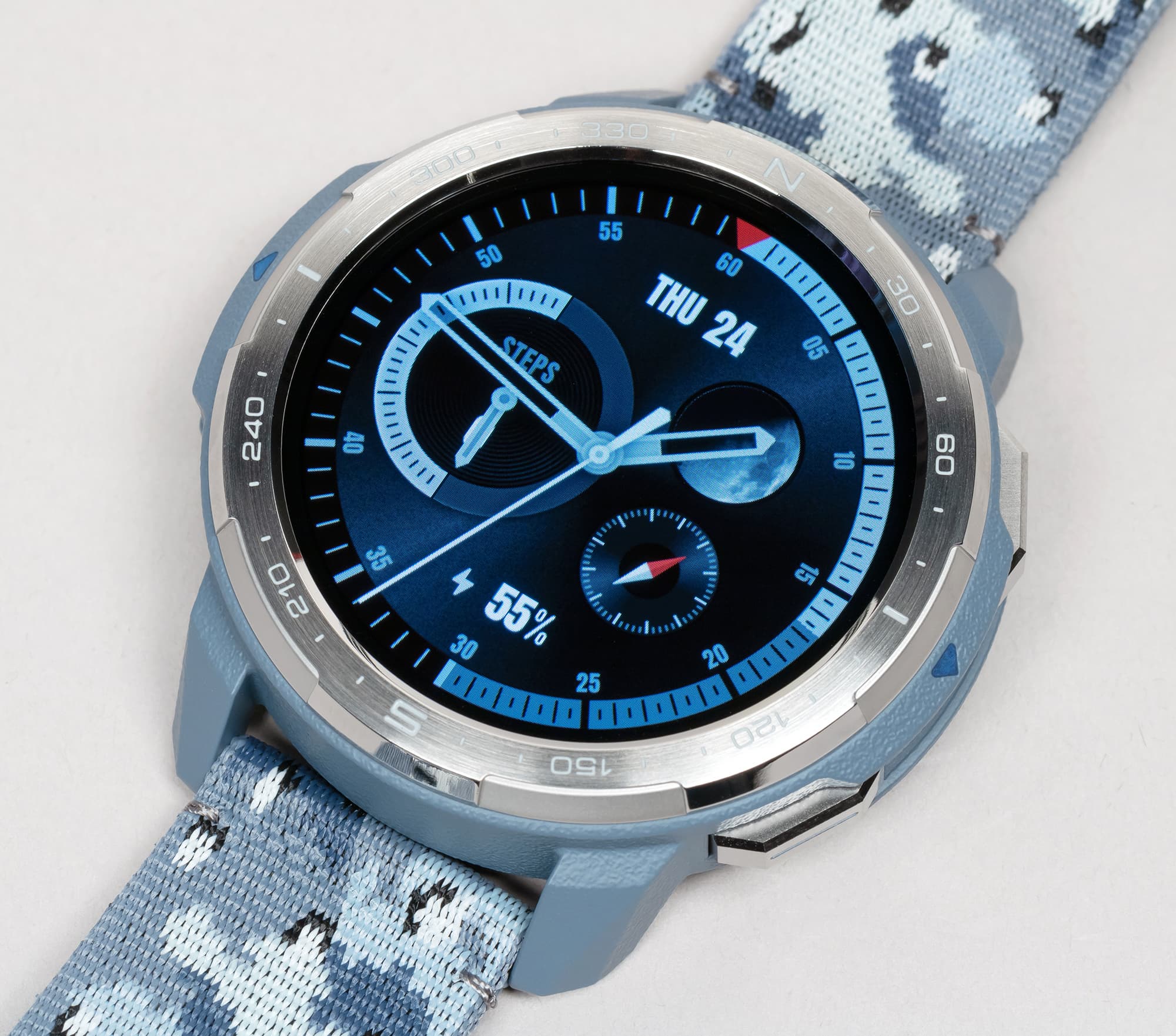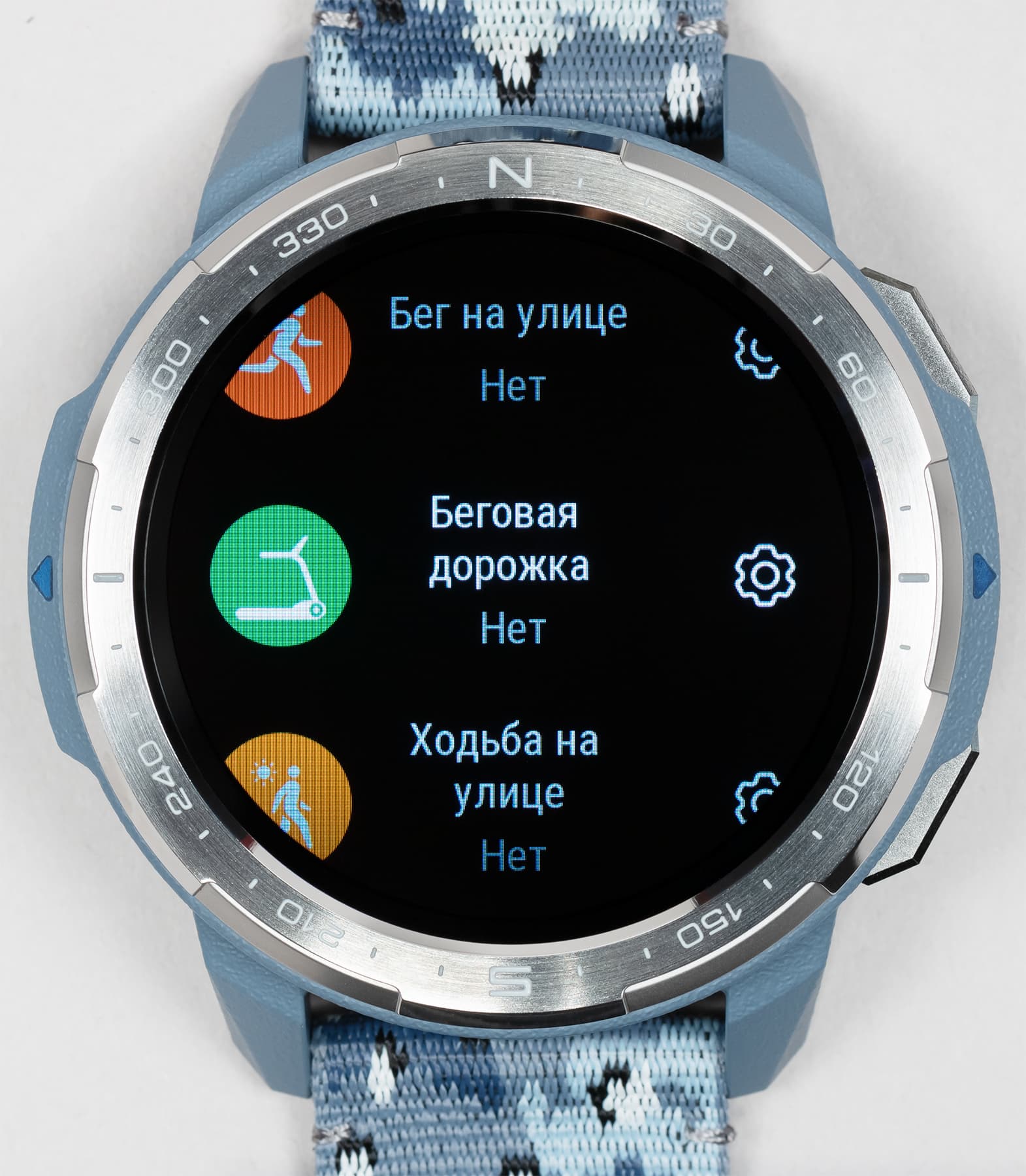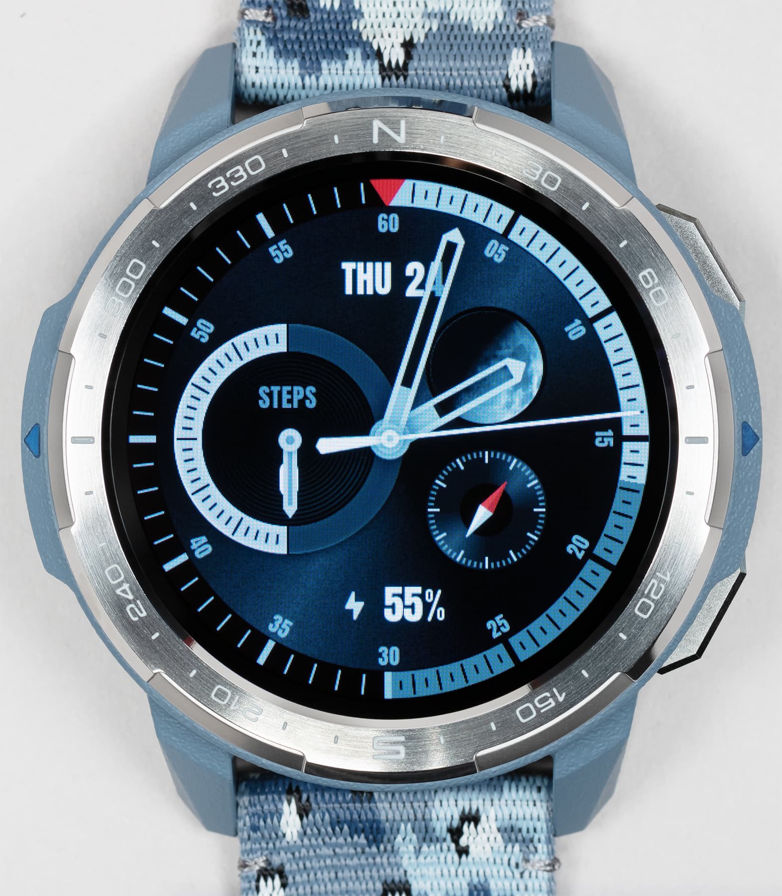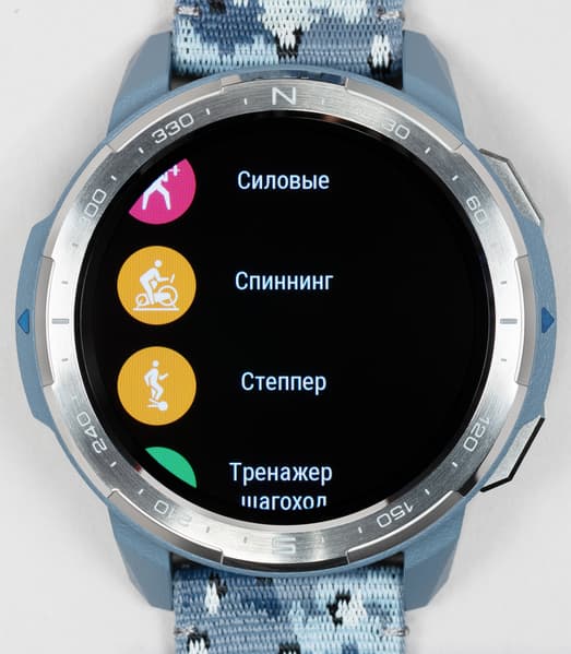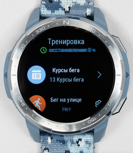 Возвращаясь к дизайну часов, отметим, что на безеле имеются насечки, которые, впрочем, обозначают не привычные часы/минуты, а градусы направления (север/юг). То есть оптимально использовать его вместе с приложением «Компас». Пожалуй, это спорное решение для тех пользователей, которые не собираются использовать часы для походов, но тем самым производитель дополнительно подчеркивает их направленность.