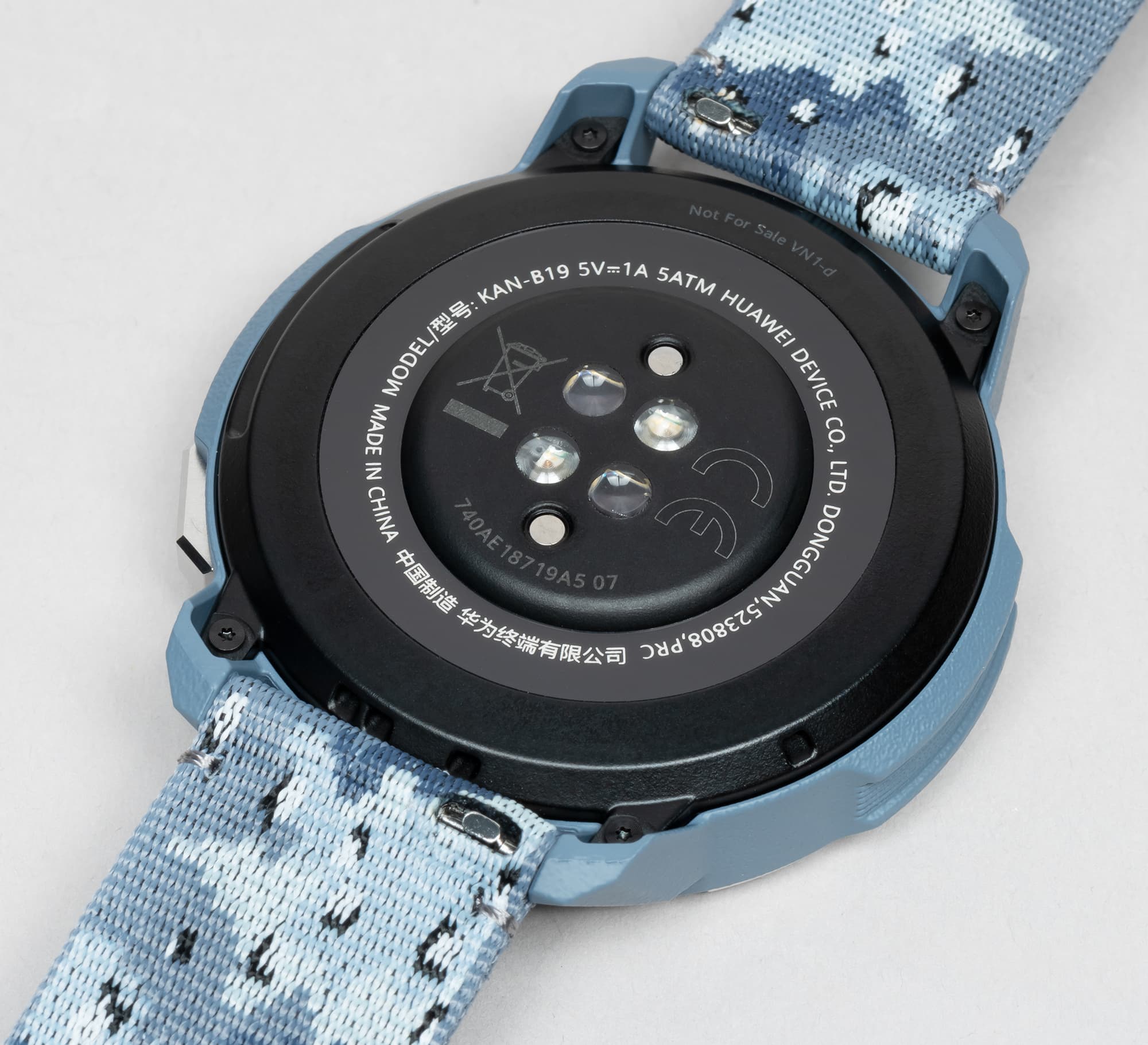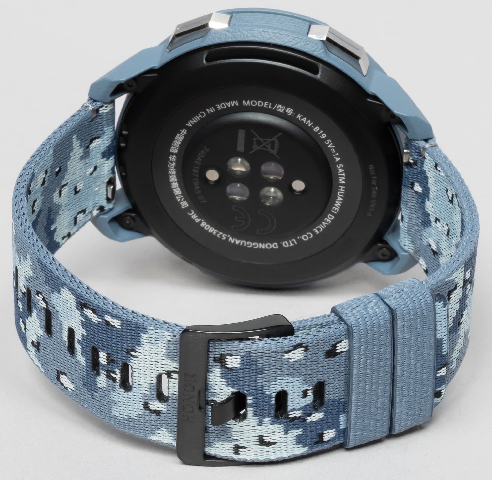 Тыльная поверхность корпуса часов выполнена из черного матового пластика. По центру расположен модуль оптического пульсомера, состоящий из двух светодиодов и двух фотодетекторов, а также два магнитных металлических контакта для соприкосновения с контактами зарядной площадки.