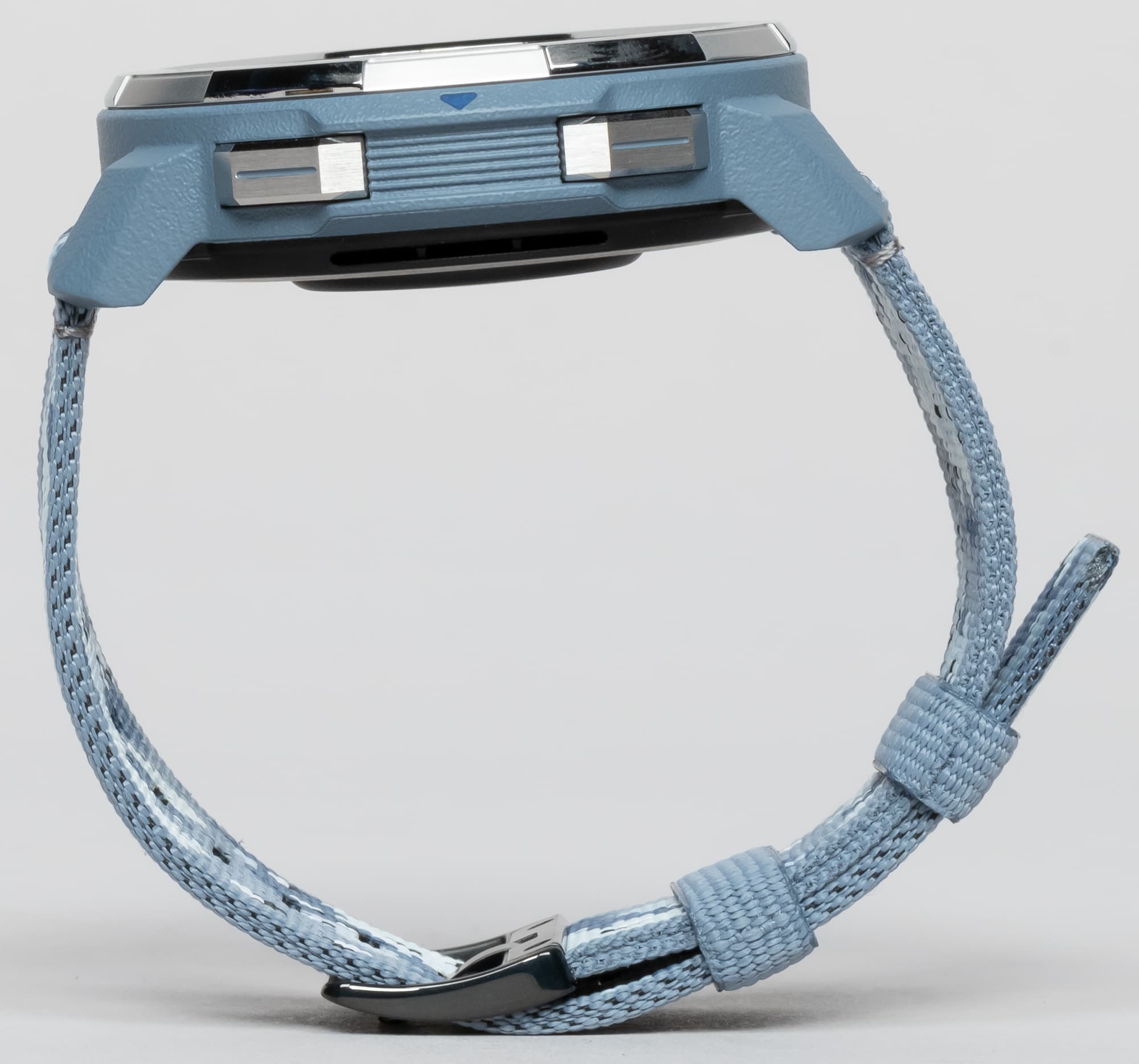 Внешний вид самих часов легче всего описать словом «брутальный». Они действительно очень массивные, с широким металлическим безелем, рублеными металлическими же кнопками и крупными пластиковыми петлями-креплениями к ремешку.