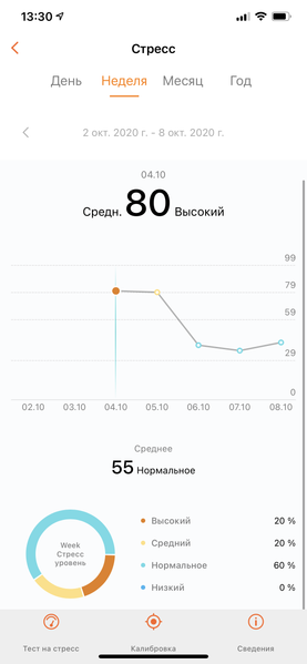 4 октября у автора было очень ответственное и тревожное дело, а 5-го он отправился в командировку в другой город, плохо выспавшись — и устройство выдало высокий уровень стресса в оба дня. А уже 6 октября выспаться удалось и все было куда спокойнее. Наконец, 7-го автор вернулся в Москву — и стресс еще уменьшился. В общем, это достаточно точное попадание.