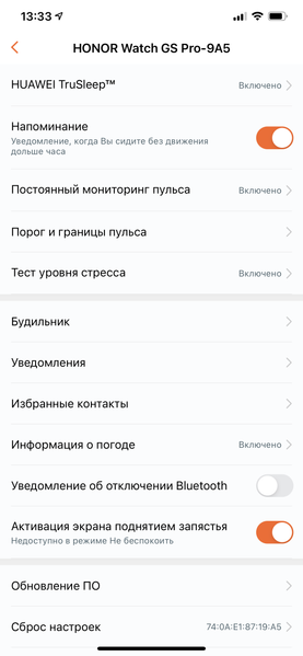 В настройках есть несколько важных пунктов, от которых зависит продолжительность работы часов без подзарядки. Это постоянный мониторинг пульса и тест уровня стресса. Если они активированы, то, соответственно, устройство будет разряжаться быстрее.