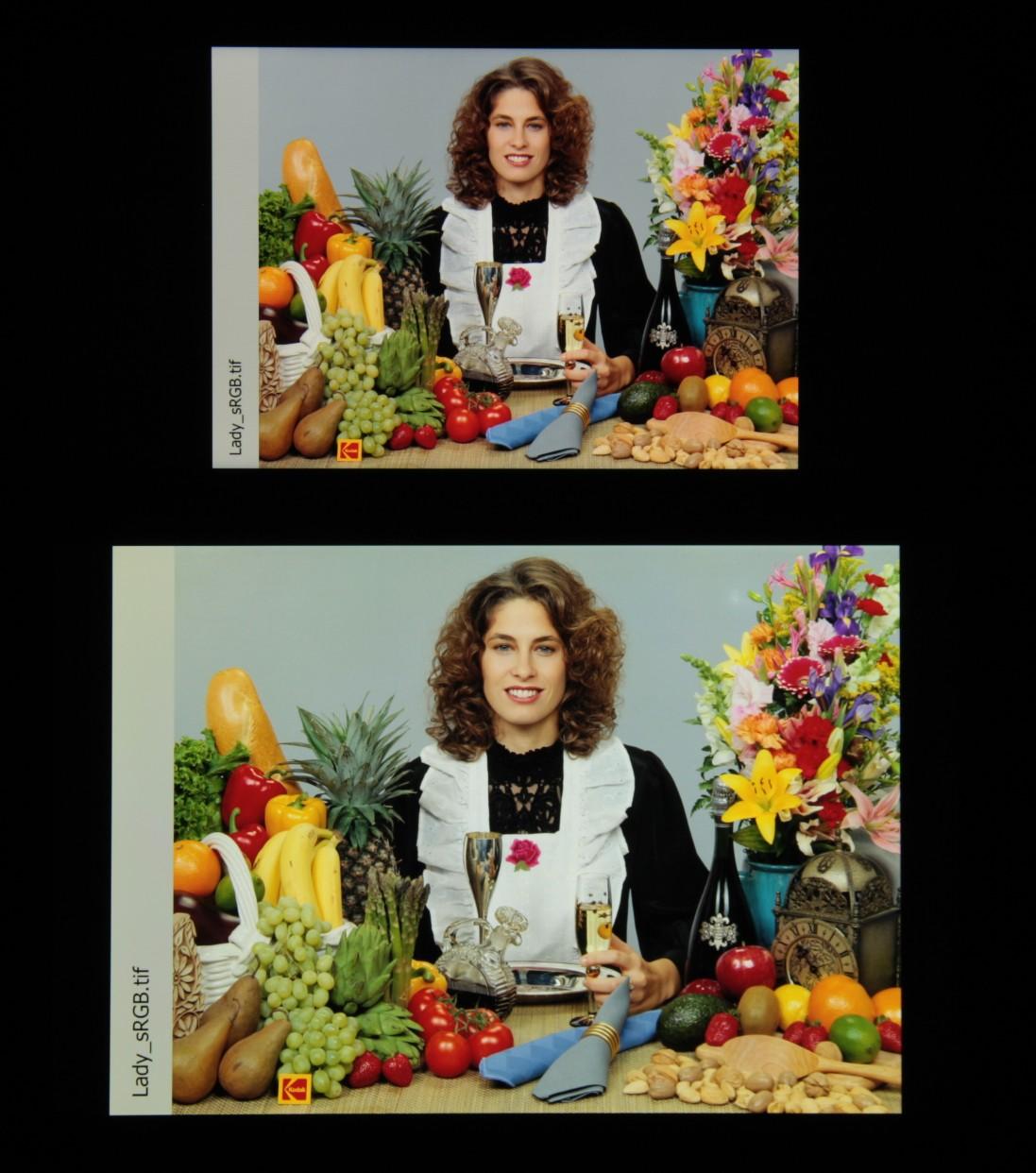 Цветопередача хорошая, цвета в меру насыщенные, цветовой баланс у экранов немного различается. Напомним, что фотография не может служить надежным источником сведений о качестве цветопередачи и приводится только для условной наглядной иллюстрации. Причина в том, что спектральная чувствительность матрицы фотоаппарата неточно совпадает с этой характеристикой человеческого зрения.