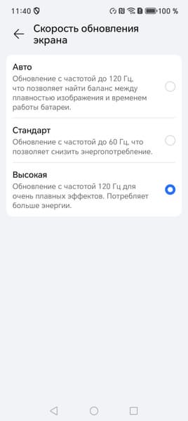 В настройках экрана можно включить режимы с повышенной до 120 Гц частотой обновления, притом в режиме Авто нам обещают автоматический выбор частоты: