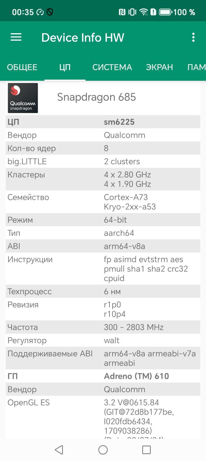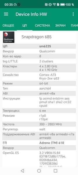 - SoC Qualcomm SM6225 Snapdragon 685, 8 процессорных ядер (4×Cortex-A73 @2,8 ГГц + 4×Cortex-A53 @1,9 ГГц)