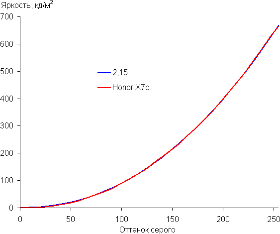 Контрастность (примерно в центре экрана) высокая — порядка 1350:1. Время отклика при переходе черный-белый-черный равно 23 мс (11 мс вкл. + 12 мс выкл.). Переход между полутонами серого 25% и 75% (по численному значению цвета) и обратно в сумме занимает 39 мс. Построенная по 32 точкам с равным интервалом по численному значению оттенка серого гамма-кривая не выявила завала ни в светах, ни в тенях. Показатель аппроксимирующей степенной функции равен 2,15, что немного ниже стандартного значения 2,2. При этом реальная гамма-кривая мало отклоняется от степенной зависимости: