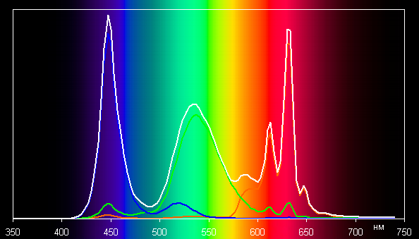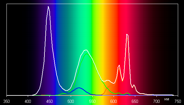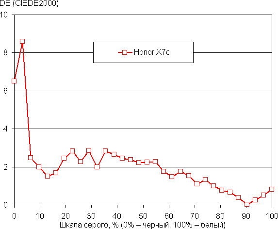 Коррекцией (точка на круге — как на снимке выше) цветовой баланс удается улучшить — цветовая температура близка к стандартным 6500 К, и отклонение от спектра абсолютно черного тела (ΔE) ниже 3 единиц, что даже для профессионального устройства считается хорошим показателем. При этом цветовая температура и ΔE мало изменяются от оттенка к оттенку — это положительно сказывается на визуальной оценке цветового баланса. (Самые темные области шкалы серого можно не учитывать, так как там баланс цветов не имеет большого значения, да и погрешность измерений цветовых характеристик на низкой яркости большая.)