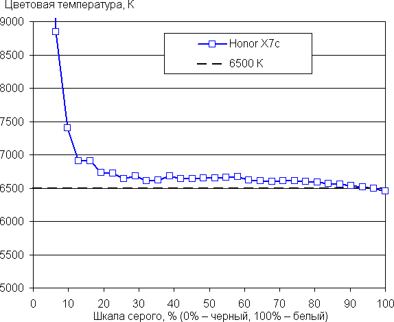 В этом устройстве есть возможность скорректировать цветовой баланс с помощью выбора профиля цветовой температуры или регулировки оттенка на цветовом круге. Баланс оттенков на шкале серого после выбора профиля Обычные без коррекции немного компромиссный, так как цветовая температура заметно выше стандартных 6500 К — порядка 7030 К.