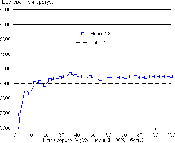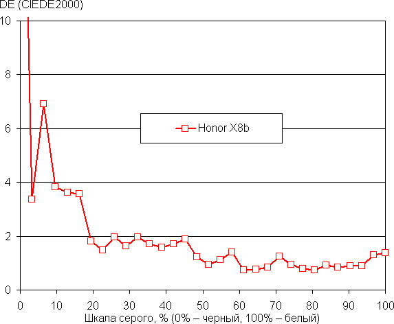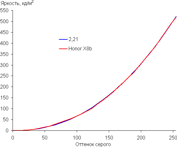 Напомним, что в случае OLED-экранов яркость фрагментов изображения динамично меняется в соответствии с характером выводимого изображения — чуть уменьшается для светлых в целом изображений. В итоге полученная зависимость яркости от оттенка (гамма-кривая), скорее всего, не соответствует гамма-кривой статичного изображения, так как измерения проводились при последовательном выводе оттенков серого почти на весь экран.
