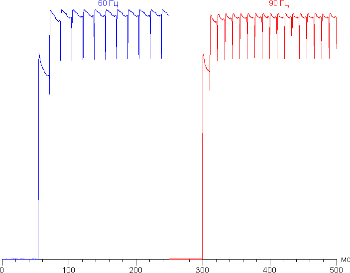 В эти режимах плавность прокрутки (списков в меню и т. д.) заметно повышается. Посмотрим, изменится ли при этом характер модуляции. Режим с частотой обновления 90 Гц: