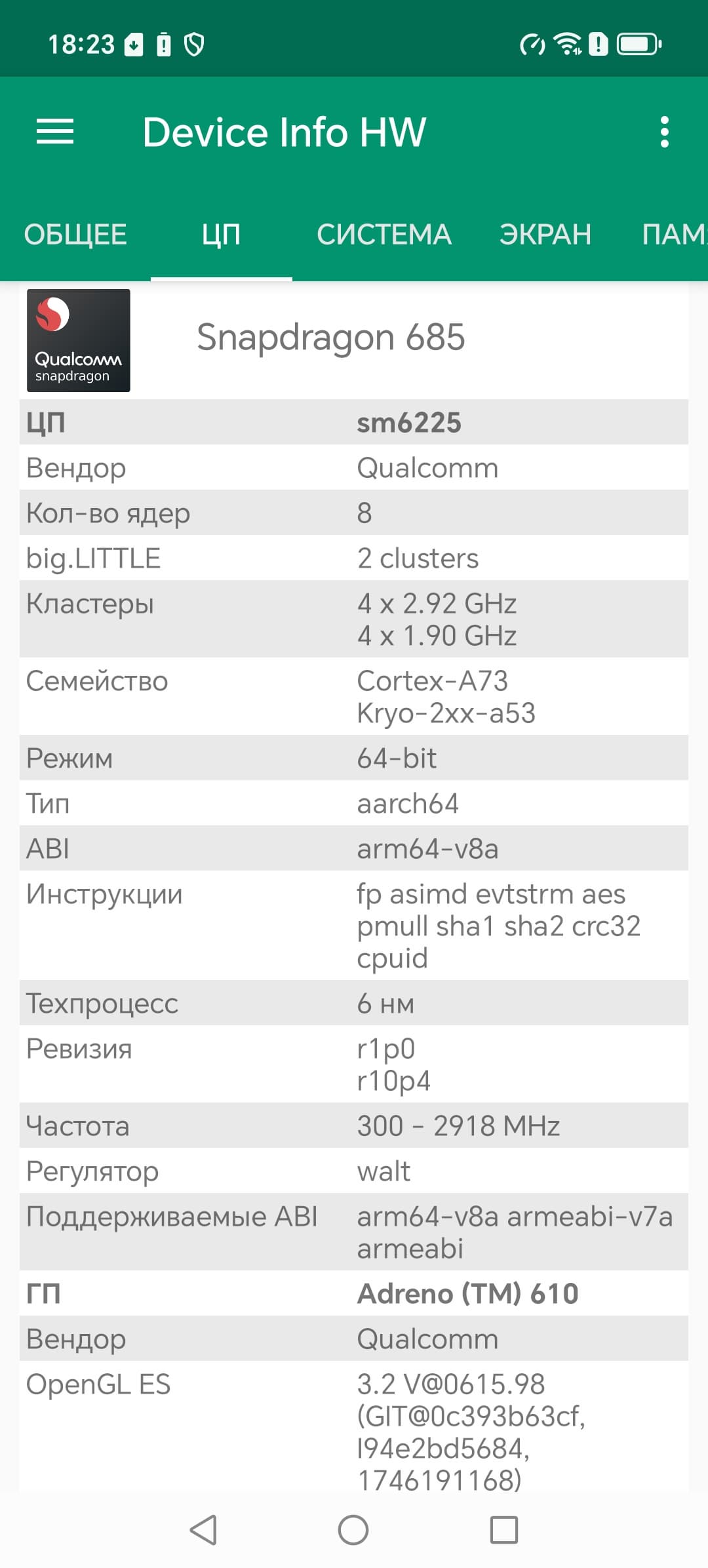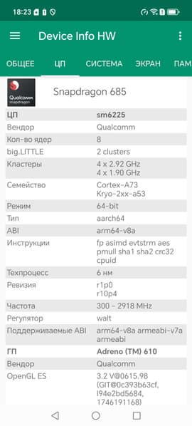- SoC Qualcomm Snapdragon 6s Gen 2, 8 процессорных ядер (4×Cortex-A73 @2,9 ГГц + 4×Cortex-A53 @1,9 ГГц)