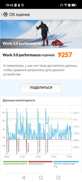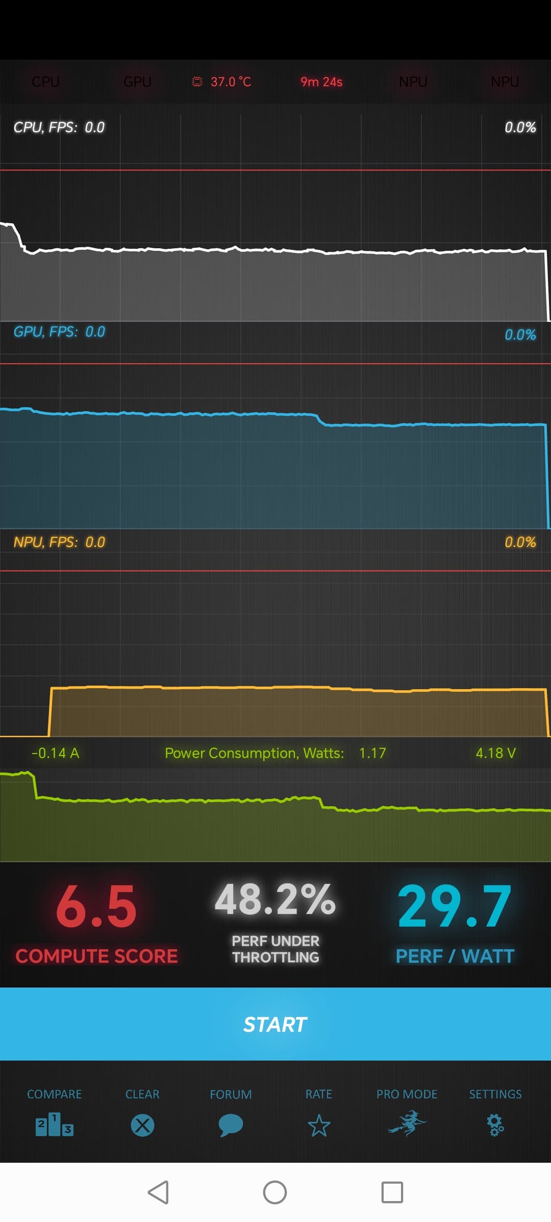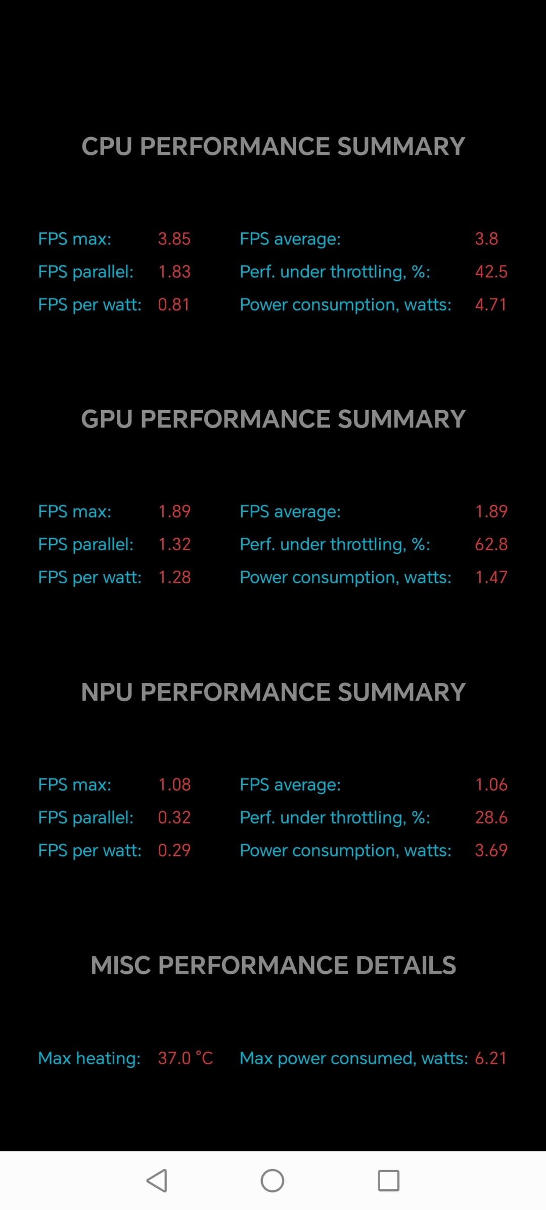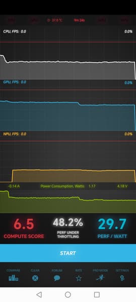 Тест на снижение производительности при нагреве мы проводим с помощью программы Burnout Benchmark, которая позволяет нагружать CPU, GPU и NPU. Уровень тротлинга GPU сравнительно невысок, но это единственное достоинство SoC.
