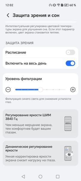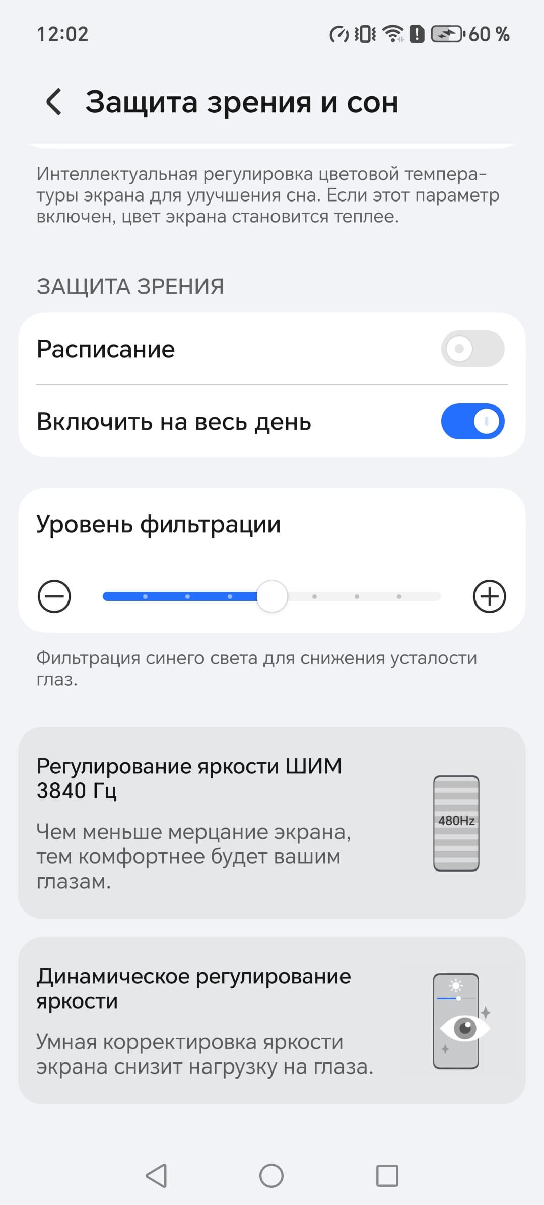 По факту из всех опробованных нами программ режим 120 Гц устанавливался только в меню с настройками смартфона. В других программах частота обновления повышалась максимум до 90 Гц. При этом независимо от выбора пользователя частота обновления всегда снижается до 60 Гц через пару секунд после последнего прикосновения к экрану. В режимах 90 или 120 Гц плавность прокрутки (списков в меню и т.д.) заметно повышается. Характер модуляции при этом принципиально не меняется, видимого мерцания все также нет.