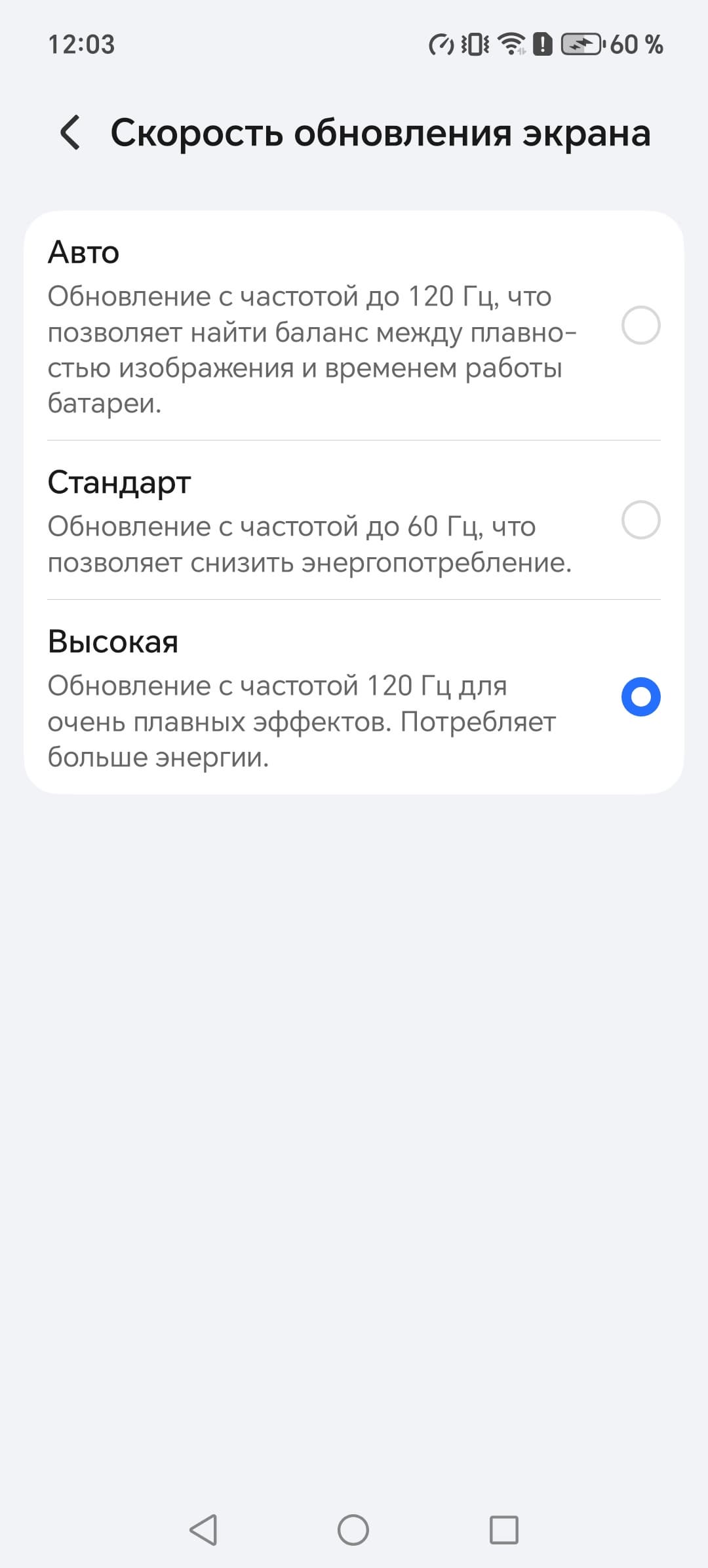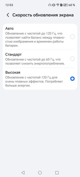 В настройках экрана можно включить режим с повышенной до 120 Гц частотой обновления: