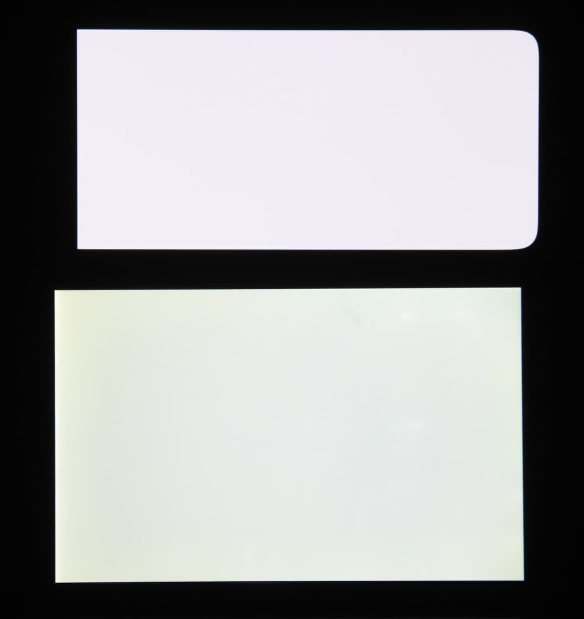 Цвета перенасыщенные, цветовой баланс у экранов немного различается. Напомним, что фотография не может служить надежным источником сведений о качестве цветопередачи и приводится только для условной наглядной иллюстрации. В частности, выраженный красноватый оттенок белого и серого полей, присутствующий на фотографиях экрана смартфона, при перпендикулярном взгляде визуально отсутствует, что подтверждается аппаратными тестами с помощью спектрофотометра. Причина в том, что спектральная чувствительность матрицы фотоаппарата неточно совпадает с этой характеристикой человеческого зрения.