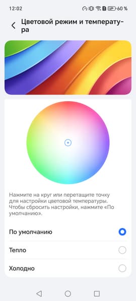 В этом устройстве есть возможность скорректировать цветовой баланс с помощью выбора профиля цветовой температуры или регулировки оттенка на цветовом круге.
