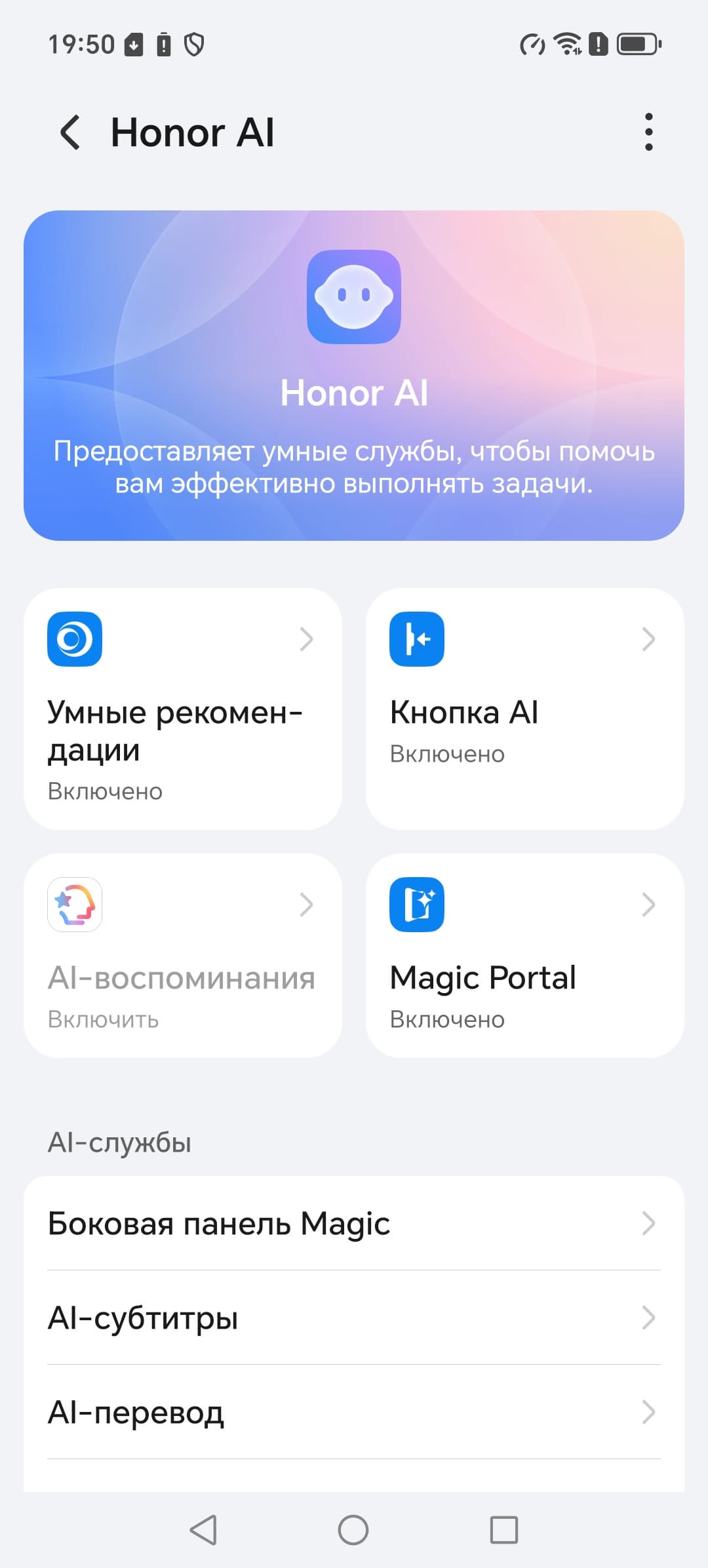 Отдельная боковая аппаратная кнопка активирует по умолчанию доступ к AI-службам: перевод: AI-перевод, AI-субтитры, Заметки с AI, AI-диктофон, Редактор текста, и Magic Portal 2.0. Также Honor X8d поддерживает AI-инструменты для редактирования изображений: AI-ластик, AI- апскейл, AI-расширение, Открытые глаза с AI и Удаление отражений с AI.