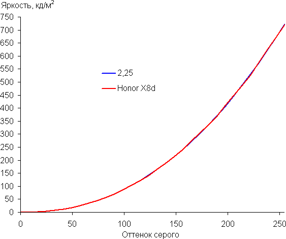 Построенная по 32 точкам с равным интервалом по численному значению оттенка серого гамма-кривая показала, что существенного завала нет ни в светах, ни в тенях. Показатель аппроксимирующей степенной функции равен 2,25, что немного выше стандартного значения 2,2, при этом реальная гамма-кривая мало отклоняется от степенной зависимости: