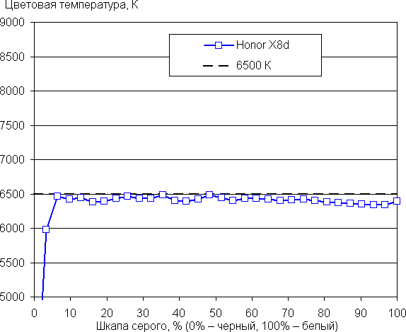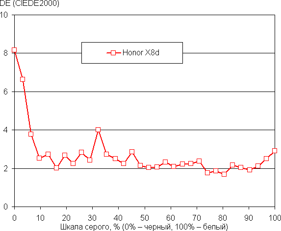 Напомним, что в случае AMOLED-экранов яркость фрагментов изображения динамично меняется в соответствии с характером выводимого изображения — чуть уменьшается для светлых в целом изображений. В итоге полученная зависимость яркости от оттенка (гамма-кривая), скорее всего, не соответствует гамма-кривой статичного изображения, так как измерения проводились при последовательном выводе оттенков серого почти на весь экран.