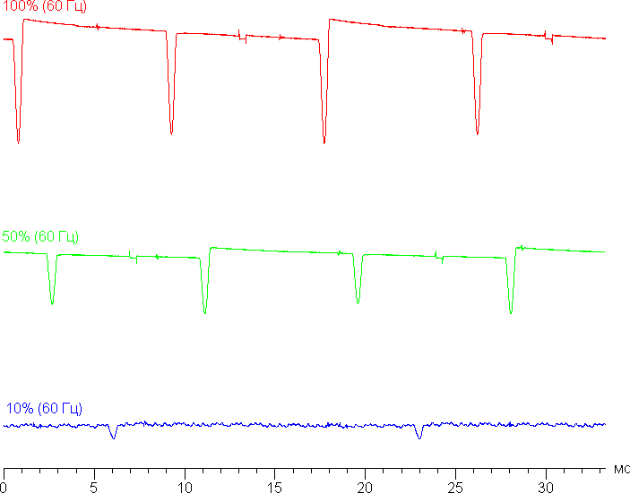 На любом уровне яркости присутствует значимая модуляция с частотой 60, 90 или 120 Гц (частоты на самом деле немного ниже). На рисунках ниже приведены зависимости яркости (вертикальная ось) от времени (горизонтальная ось) для нескольких значений настройки яркости в случае режима с частотой обновления 60 Гц: