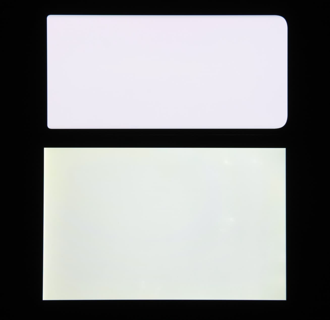 Экран характеризуется великолепными углами обзора. Даже белый цвет при отклонении на большие углы оттенок практически не приобретает, что в случае OLED встречается нечасто. Черный цвет остается просто черным под любыми углами. Он настолько черный, что параметр контрастности в данном случае неприменим. Для сравнения приведем фотографии, на которых на экраны смартфона и второго участника сравнения выведены одинаковые изображения, при этом яркость экранов изначально установлена примерно на 200 кд/м², а цветовой баланс на фотоаппарате принудительно переключен на 6500 К.