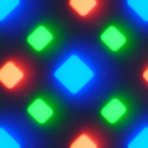 В этом экране используется матрица AMOLED — активная матрица на органических светодиодах. Полноцветное изображение создается с помощью субпикселей трех цветов — красного (R), зеленого (G) и синего (B), но красных и синих субпикселей в два раза меньше, что можно обозначить как RGBG. Это подтверждается фрагментом микрофотографии: