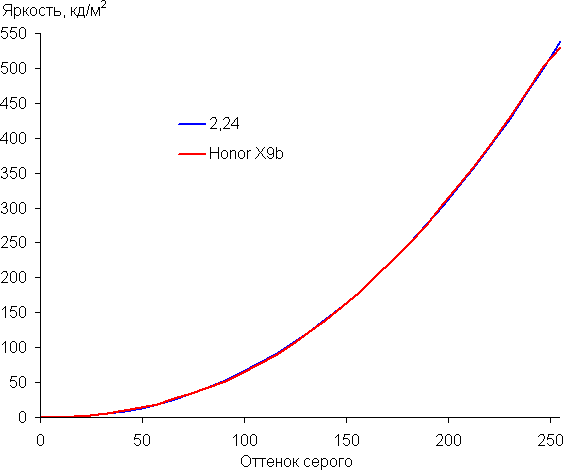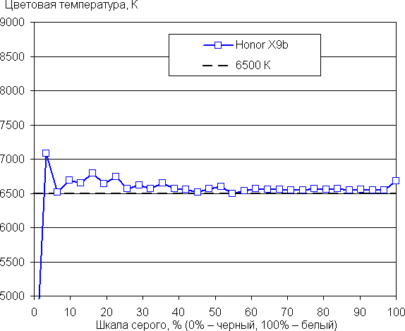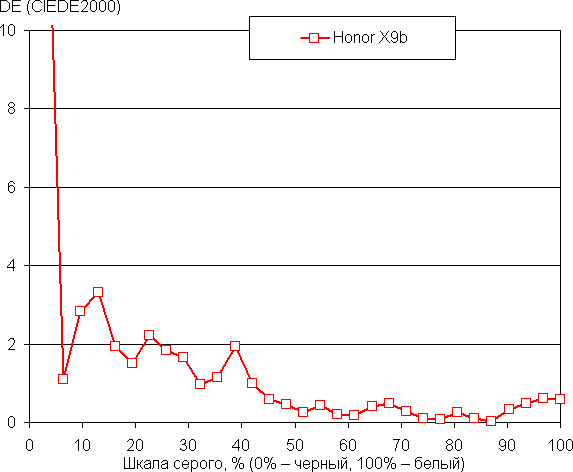 Напомним, что в случае OLED-экранов яркость фрагментов изображения динамично меняется в соответствии с характером выводимого изображения — чуть уменьшается для светлых в целом изображений. В итоге полученная зависимость яркости от оттенка (гамма-кривая), скорее всего, не соответствует гамма-кривой статичного изображения, так как измерения проводились при последовательном выводе оттенков серого почти на весь экран.