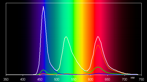 Без коррекции (вариант Яркие) спектры компонент (то есть спектры чистых красного, зеленого и синего цветов) очень хорошо разделены: