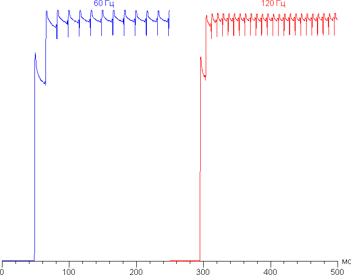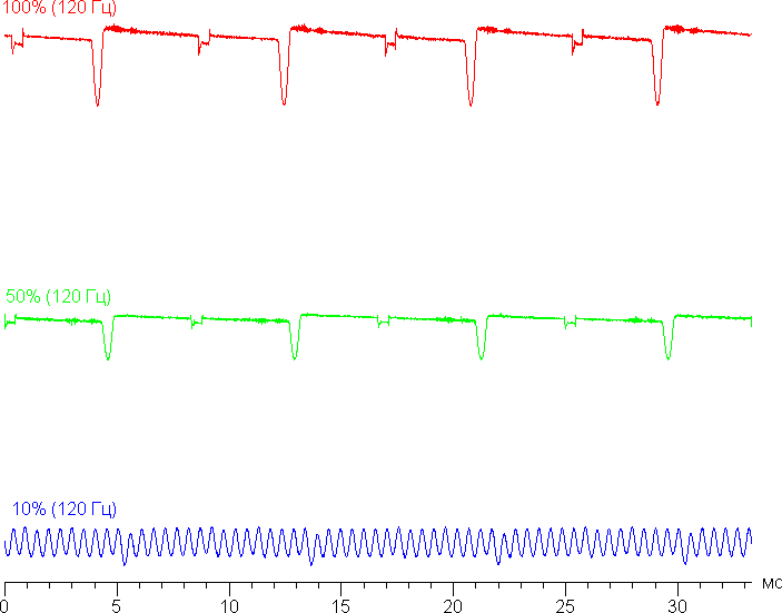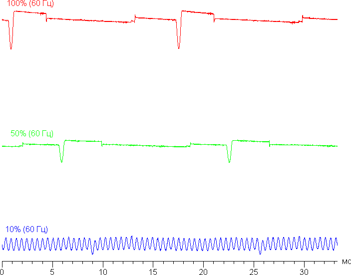 На высоком и среднем уровне яркости присутствует значимая модуляция с частотой 60 или 120 Гц. На рисунках ниже приведены зависимости яркости (вертикальная ось) от времени (горизонтальная ось) для нескольких значений настройки яркости. Сначала для режима с частотой обновления 60 Гц: