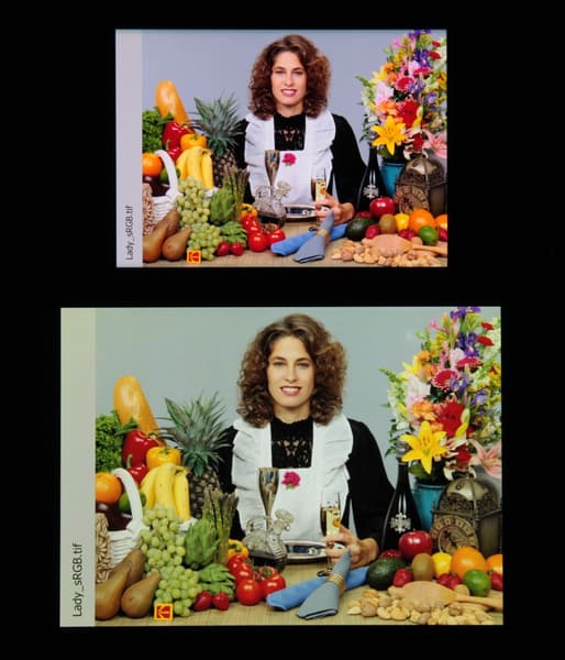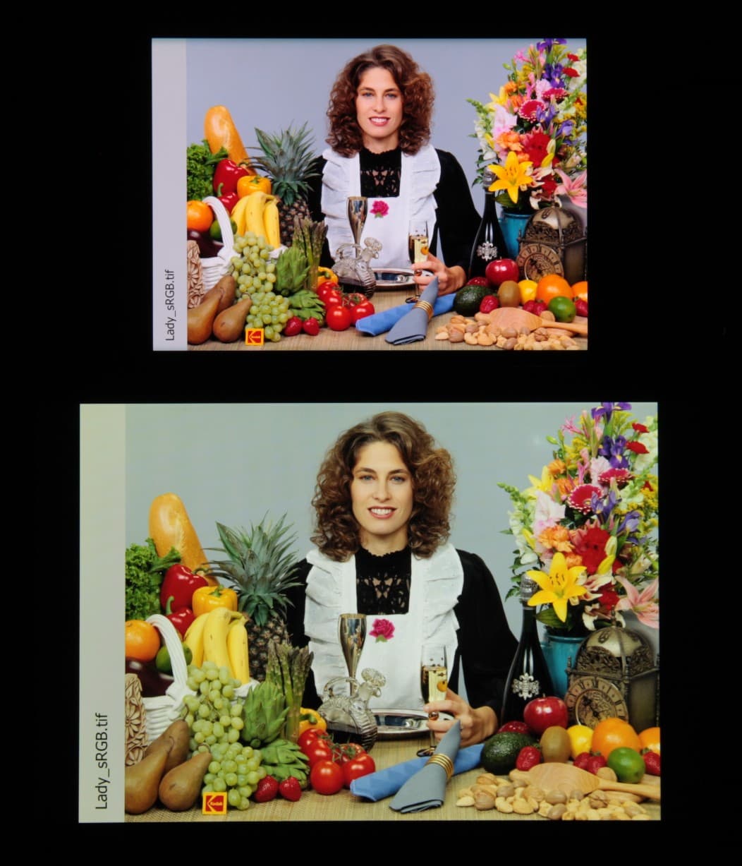 Отметим, что на экранах с уширенным цветовым охватом (без соответствующей коррекции) цвета́ обычных изображений, оптимизированных для устройств sRGB, выглядят неестественно насыщенными. Отсюда и рекомендация: в большинстве случаев смотреть кино, фотографии и все естественное лучше при выборе профиля Обычные.