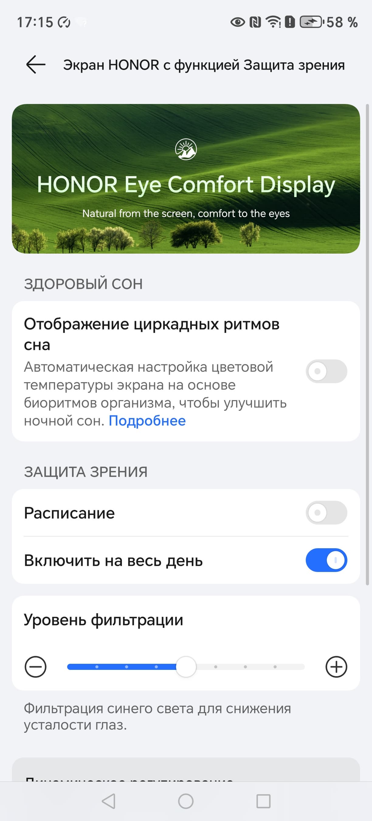 Разумеется есть функция снижения интенсивности синей компоненты: