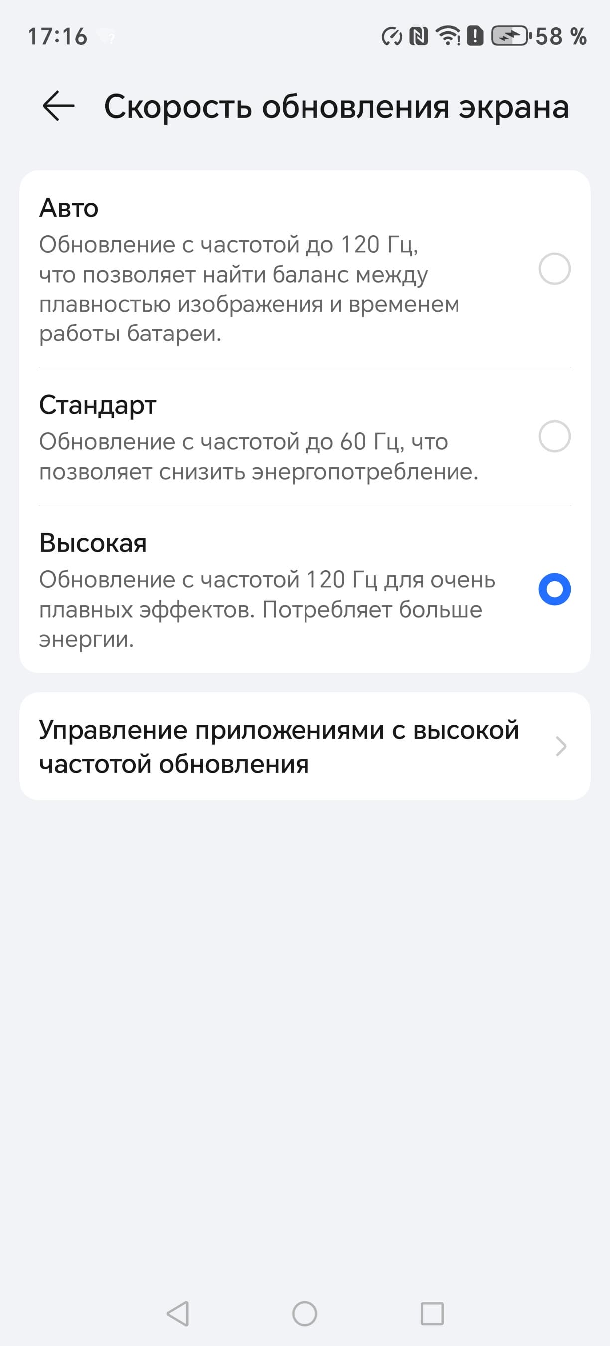 В настройках экрана можно включить режим с повышенной до 120 Гц частотой обновления: