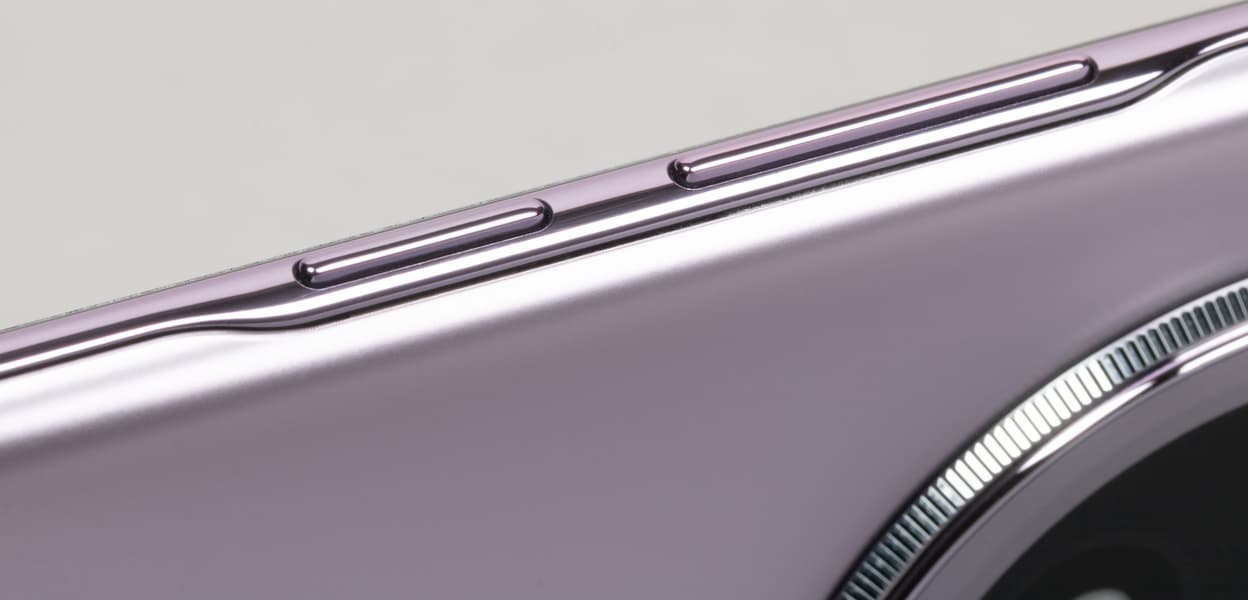 По размеру смартфон достаточно крупный, у него большой экран 6,78″, но корпус при этом не толстый, всего 8 мм без учета выступающего блока. А зауженные бока делают его визуально и тактильно еще более тонким. Боковая рамка стильно поблескивает на свету металлическим блеском, но не похоже, что это настоящий металл: ни одной перемычки по периметру рамки не замечено. Скорее всего, это металлизированный пластик. Спинка, очевидно, тоже не из стекла, а из матового практичного пластика. Это совершенно не портит дизайн, смартфон не смотрится дешево.