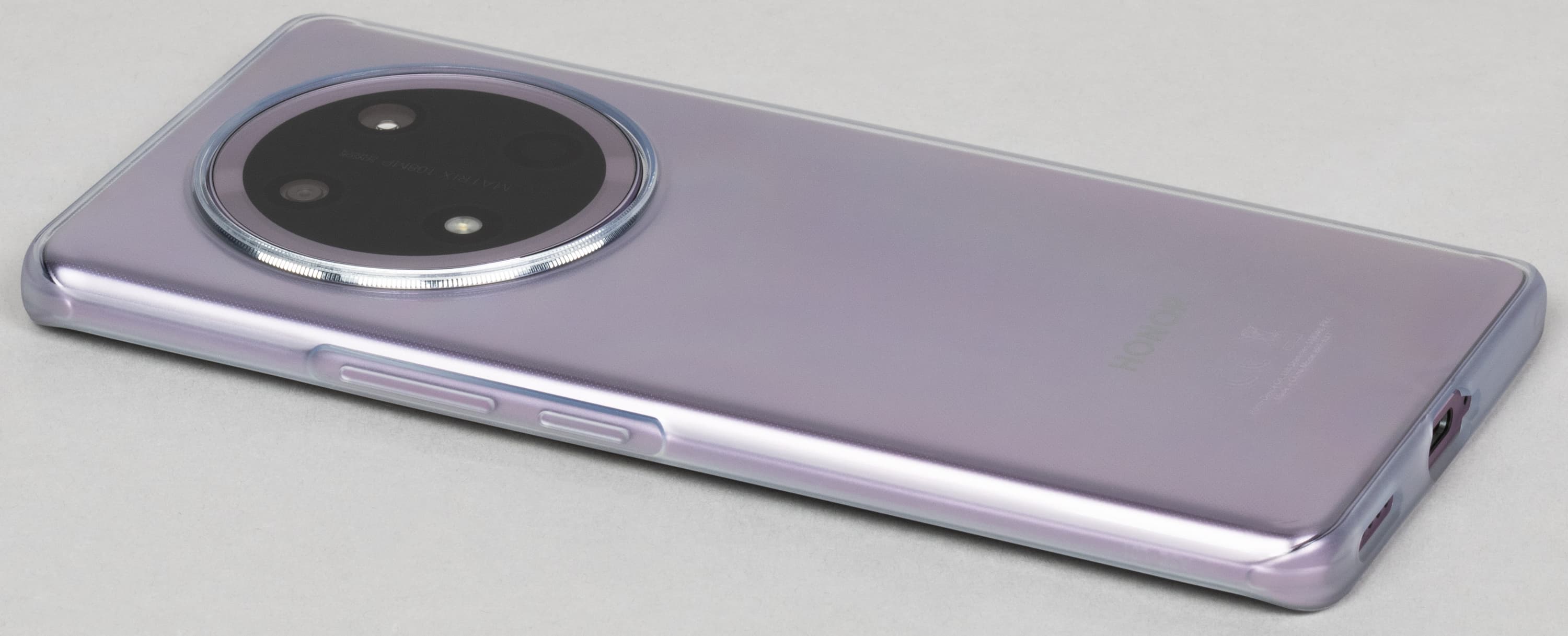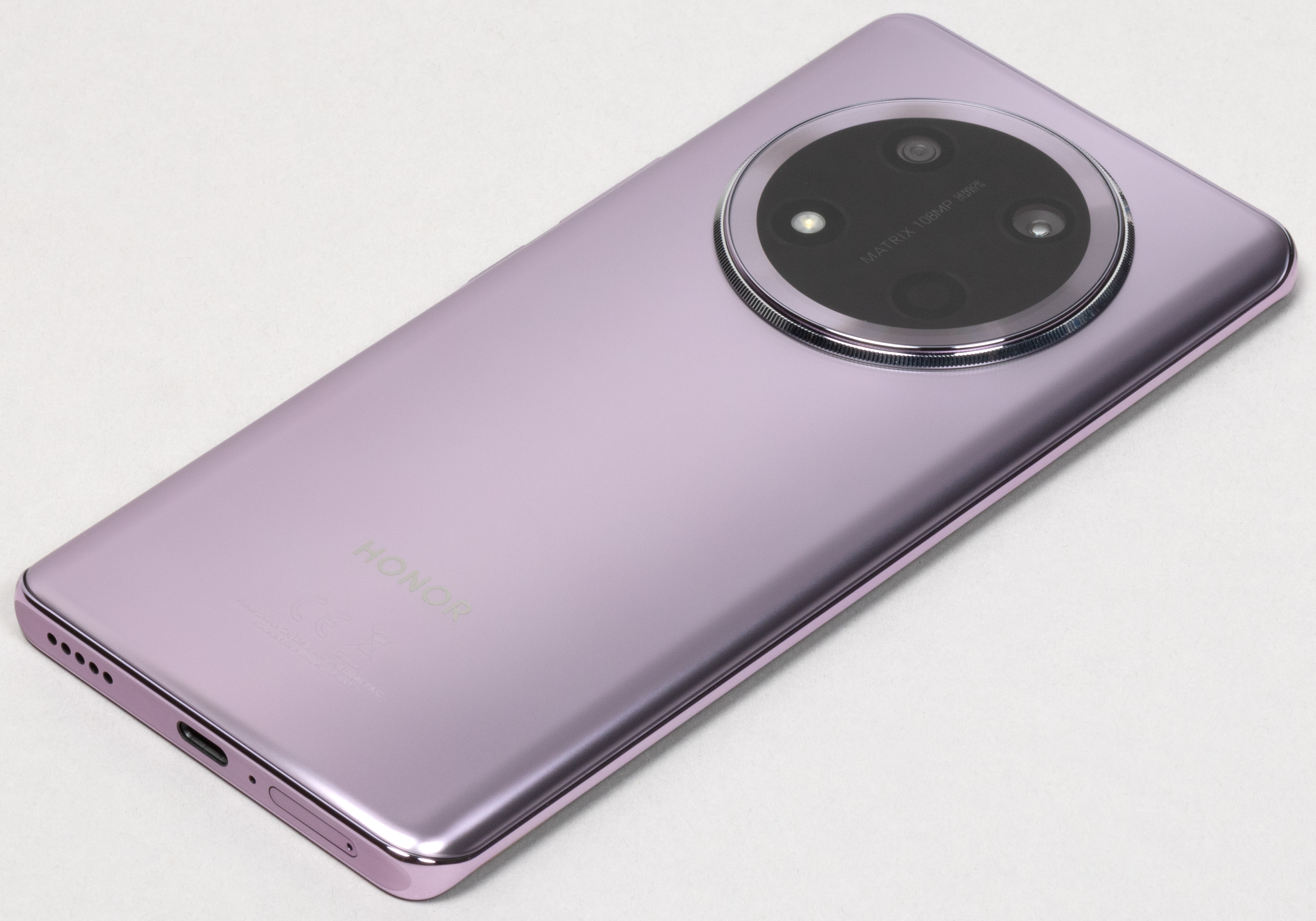 Honor X9c выпускается в трех интересных цветовых вариантах оформления корпуса. «Строгий» тут лишь черный вариант, который официально назван «Титановый черный». Два остальных более яркие, но «Титановый фиолетовый» имеет сплошной матовый окрас, а «Нефритовый зеленый» украшен произвольным узором, напоминающим текстуру этого камня.