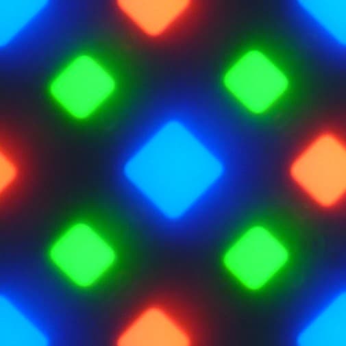 В этом экране используется матрица AMOLED — активная матрица на органических светодиодах. Полноцветное изображение создается с помощью субпикселей трех цветов — красного (R), зеленого (G) и синего (B), но красных и синих субпикселей в два раза меньше, что можно обозначить как RGBG. Это подтверждается фрагментом микрофотографии: