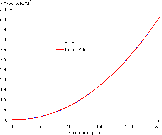 Построенная по 32 точкам с равным интервалом по численному значению оттенка серого гамма-кривая показала, что существенного завала нет ни в светах, ни в тенях. Показатель аппроксимирующей степенной функции равен 2,12, что немного ниже стандартного значения 2,2, при этом реальная гамма-кривая мало отклоняется от степенной зависимости: