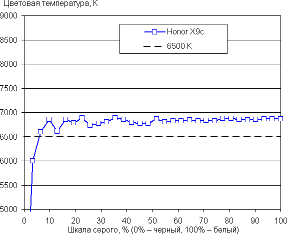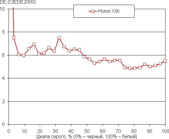 Напомним, что в случае OLED-экранов яркость фрагментов изображения динамично меняется в соответствии с характером выводимого изображения — чуть уменьшается для светлых в целом изображений. В итоге полученная зависимость яркости от оттенка (гамма-кривая), скорее всего, не соответствует гамма-кривой статичного изображения, так как измерения проводились при последовательном выводе оттенков серого почти на весь экран.