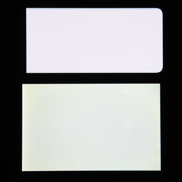 Отметим хорошую равномерность яркости и цветового тона белого поля (за исключением затемнения и изменения оттенка к загнутым краям).