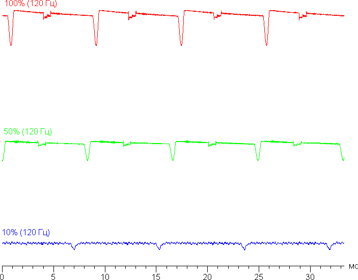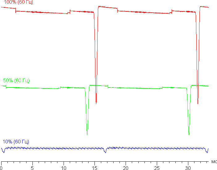 На высоком и среднем уровне яркости присутствует значимая модуляция с частотой 60 или 120 Гц. На рисунках ниже приведены зависимости яркости (вертикальная ось) от времени (горизонтальная ось) для нескольких значений настройки яркости. Сначала для режима с частотой обновления 60 Гц: