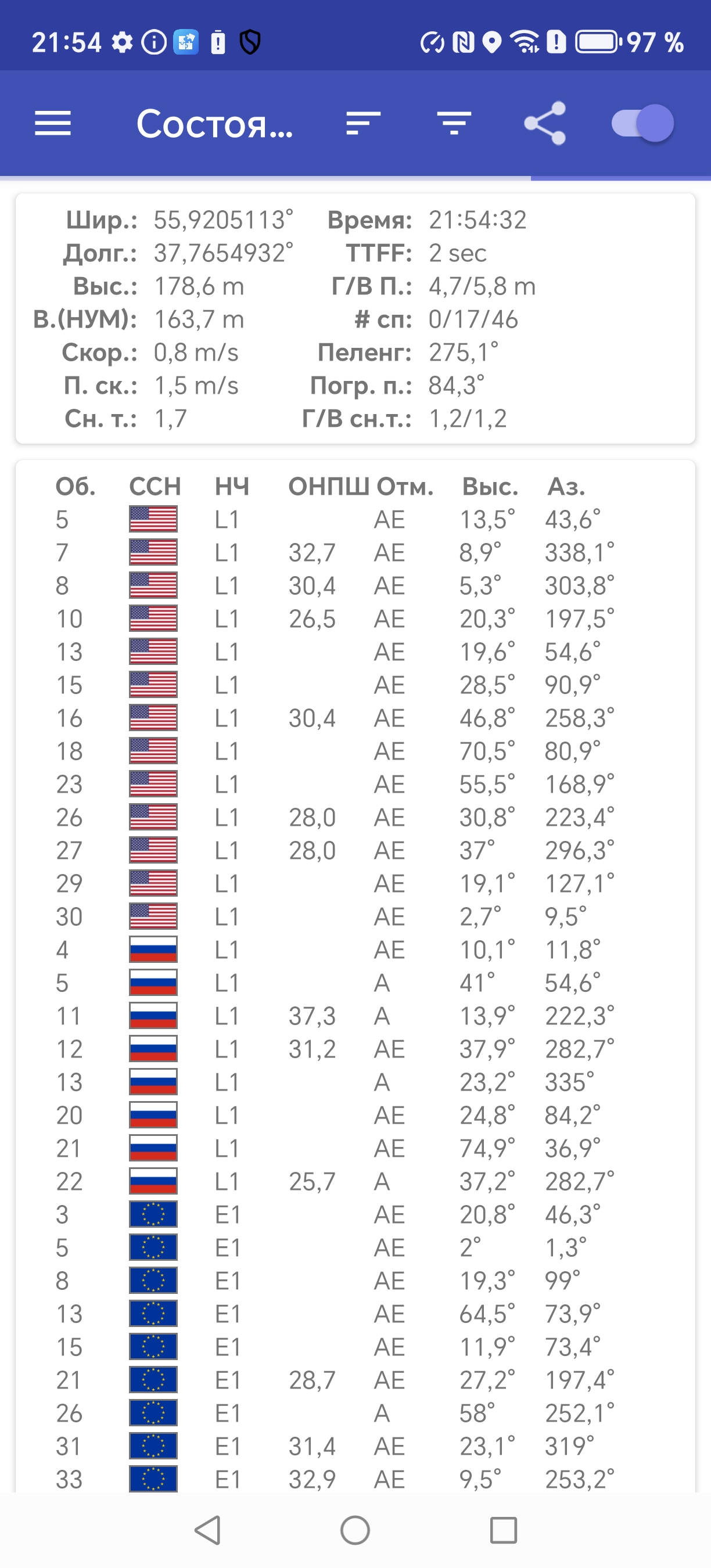 Одноканальный модуль спутниковой навигации работает с GPS, а также с Глонасс, BDS и Galileo. Первые спутники при холодном старте обнаруживаются быстро, точность позиционирования не вызывает претензий.